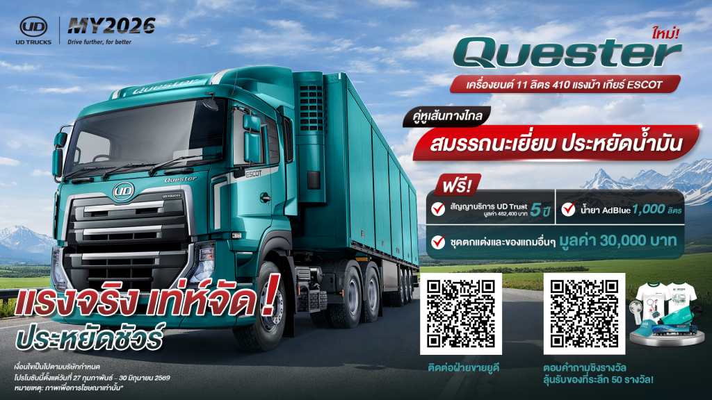Home TRANS PRODUCTBest Product UD Trucks เปิดตัว Quester MY2026 ชูเครื่องยนต์ 8 ลิตร 350 แรงม้า พร้อมโปรแรงฉลองเปิดตัว!
