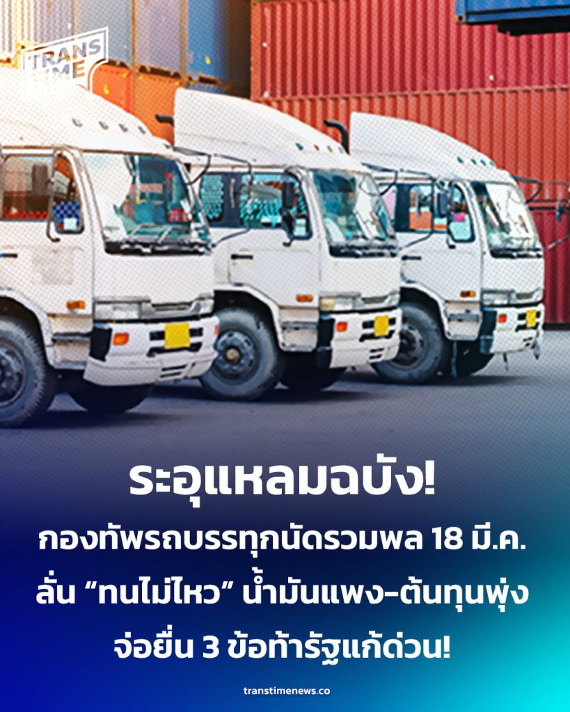 เมื่อวันที่ 17 มีนาคม 2569 แหล่งข่าวจากสมาคมขนส่งภาคตะวันออก เปิดเผยว่า กลุ่มผู้ประกอบการรถบรรทุกในภาคตะวันออก เตรียม “รวมพลังครั้งใหญ่” นัดรวมตัวกันที่ท่าเรือแหลมฉบัง ในวันที่ 18 มีนาคม ตั้งแต่เวลา 09.00 น. เป็นต้นไป เพื่อส่งเสียงตรงถึงรัฐบาล หลังต้องแบกรับต้นทุนที่พุ่งไม่หยุดจากราคาน้ำมันที่ทะยานขึ้น