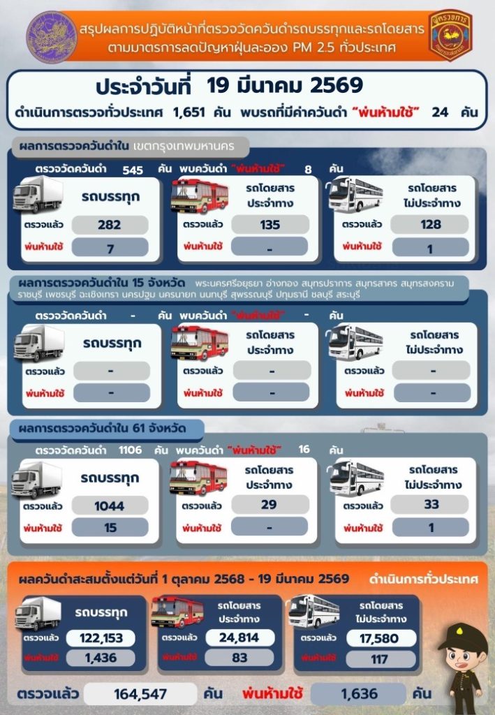 วันนี้ ( 19 มีนาคม 2569 ) นายสรพงศ์ ไพฑูรย์พงษ์ อธิบดีกรมการขนส่งทางบก เผยผลการดำเนินการตรวจควันดำรถบรรทุกและรถโดยสารทั่วประเทศซึ่งเป็นการดำเนินการตามนโยบายของรัฐบาลและกระทรวงคมนาคม เพื่อป้องกันและแก้ไขปัญหาฝุ่นละอองขนาดเล็ก PM 2.5 โดยผลการตรวจวัดควันดำวันที่ 19 มีนาคม 2569 มีผลการตรวจวัดควันดำรถโดยสารและรถบรรทุกทั่วประเทศ จำนวน 1,651 คัน พบรถที่มีค่าควันดำเกินเกณฑ์มาตรฐานที่ราชการกำหนดจำนวน 24 คัน ส่งผลให้ตั้งแต่วันที่ 1 ตุลาคม 2568 – 19 มีนาคม 2569 ดำเนินการตรวจควันดำรถทั้งสิ้น 164,547 คัน พ่นห้ามใช้แล้วจำนวน 1,636 คัน